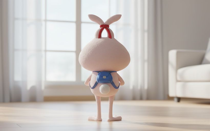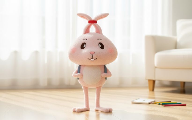 柔軟與溫暖:粉白色調、圓滾滾體態與小書包象徵陪伴。