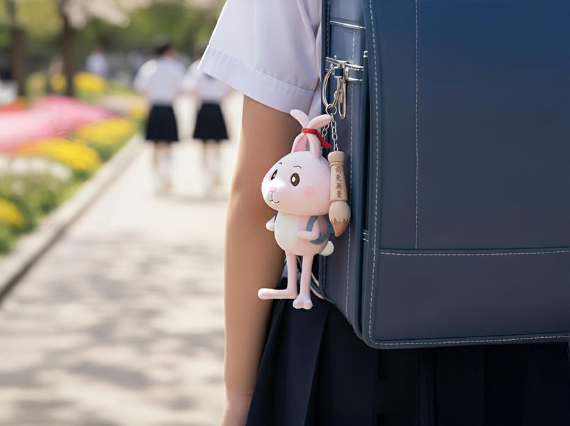 在實拍照片中,吊在書包的 Bibo 立即強化角色與「學生日常」的連結性。