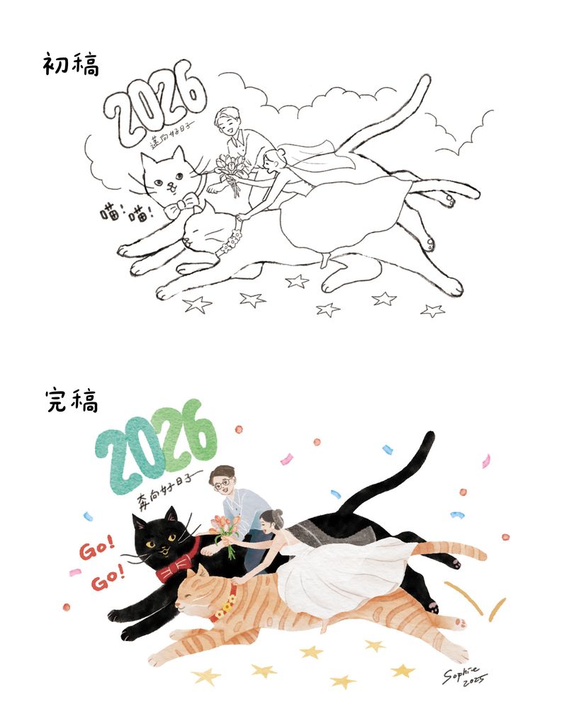 - 上半年:描繪貓咪載著新人奔跑,象徵乘載幸福、攜手向前。