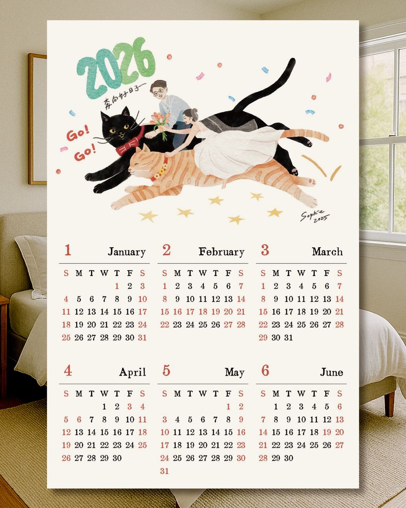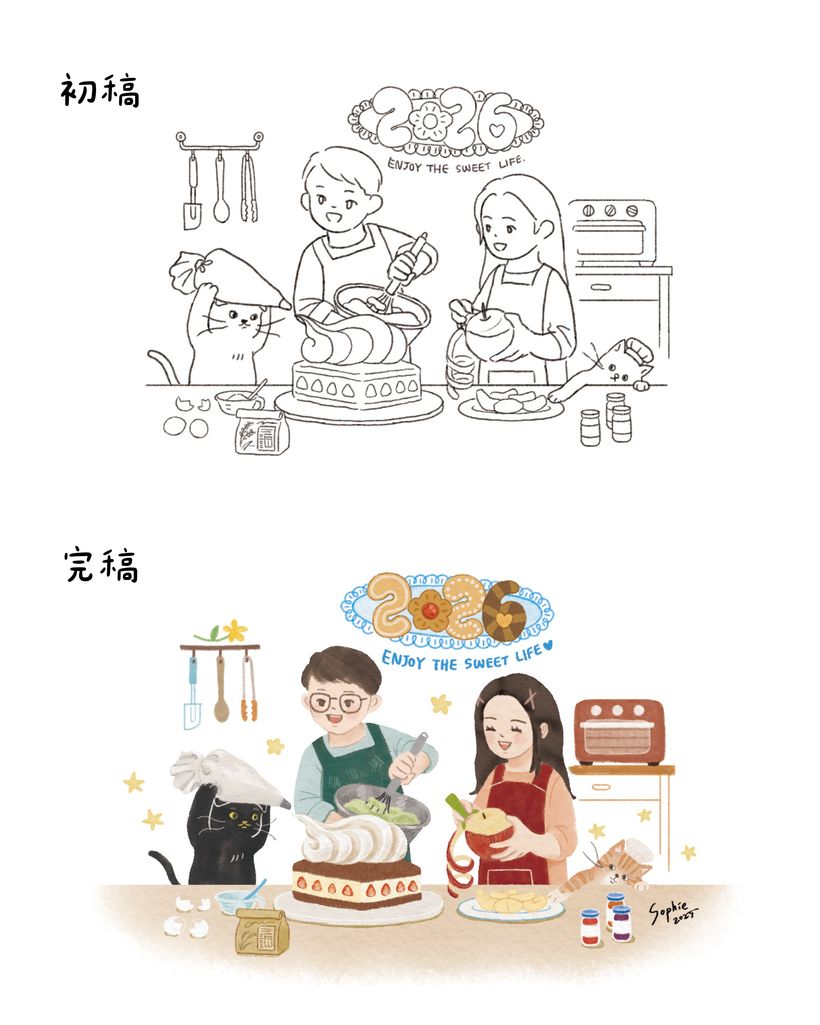 經過討論,我們設計上半年以貓咪載著新人們奔跑的畫面,象徵乘載幸福攜手向前的寓意;下半年則以新人們在廚房裡烘焙,搭配在一旁幫(ㄉㄠˇ)忙(ㄌㄨㄢˋ)的貓咪們,呈現溫暖甜蜜的日常。