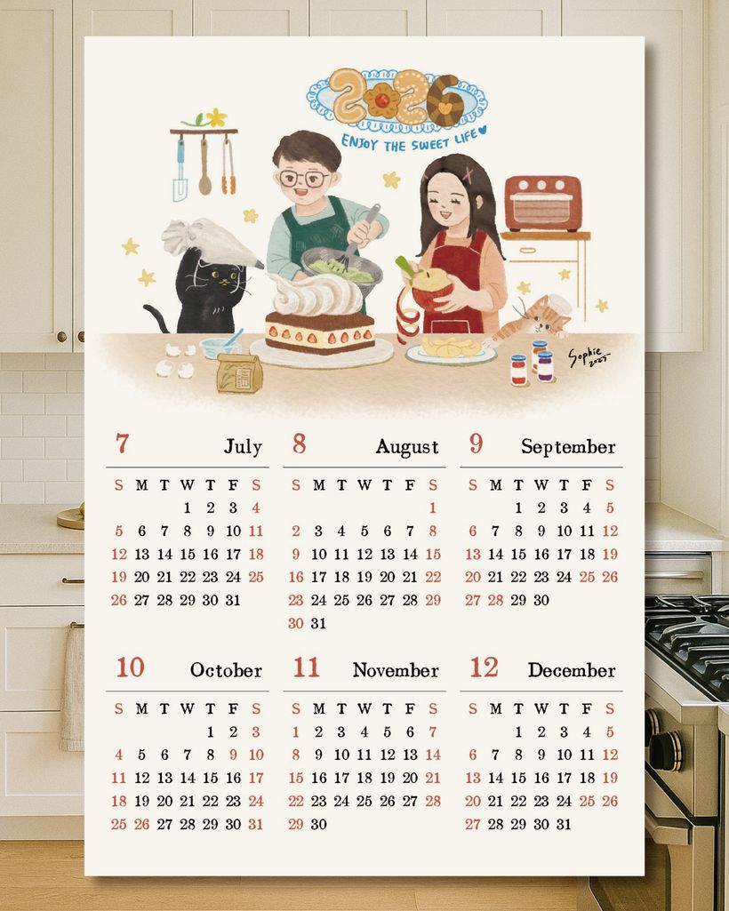 - 下半年:在廚房裡,兩人烘焙甜點,貓咪則在一旁「幫忙」又「搗亂」,溫暖而可愛。