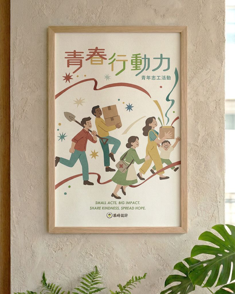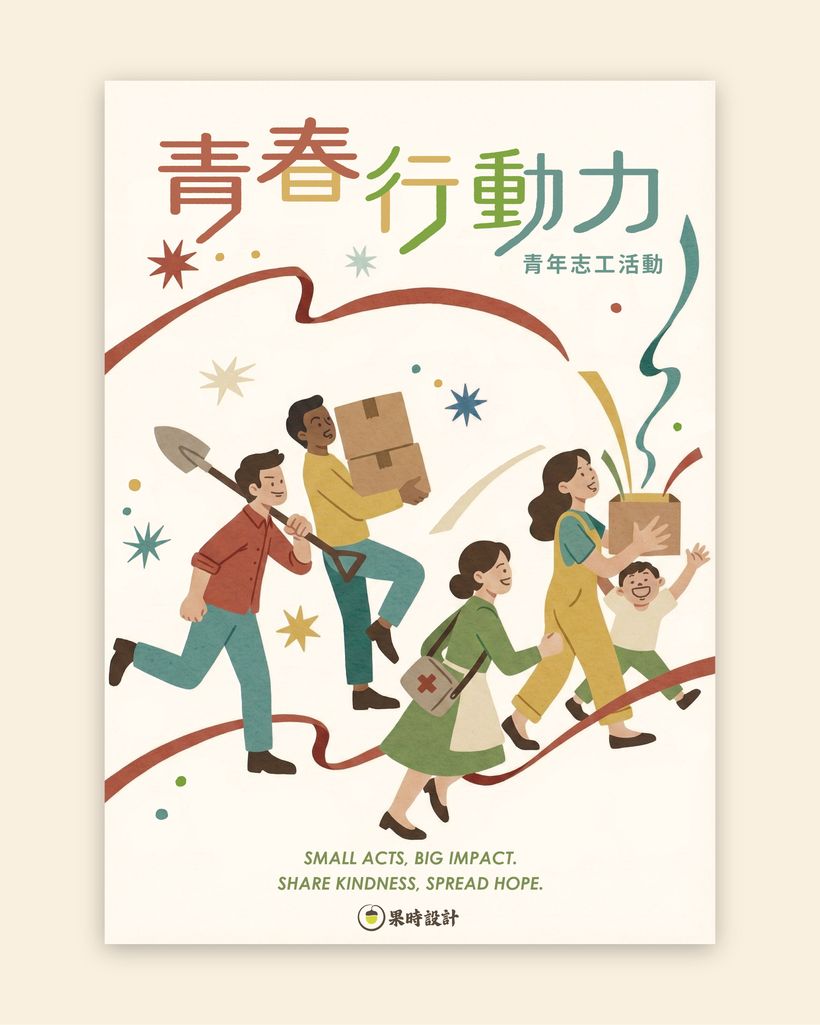 本案主視覺設計以青年志工行動為溝通核心,透過人物行進中的動態描繪,將「參與、陪伴、付出」等抽象概念轉化為具象畫面,使海報不僅傳遞活動資訊,也能在第一時間傳達行動精神,適合應用於公部門、校園與社區等公共場域。