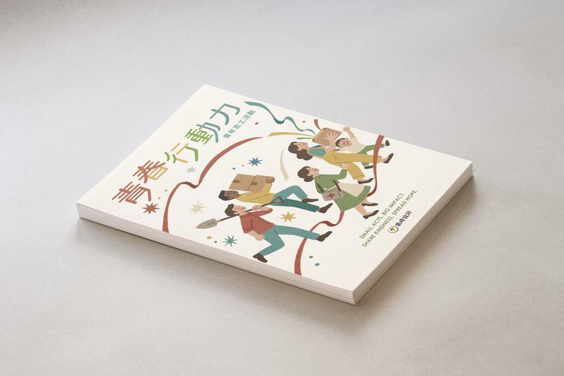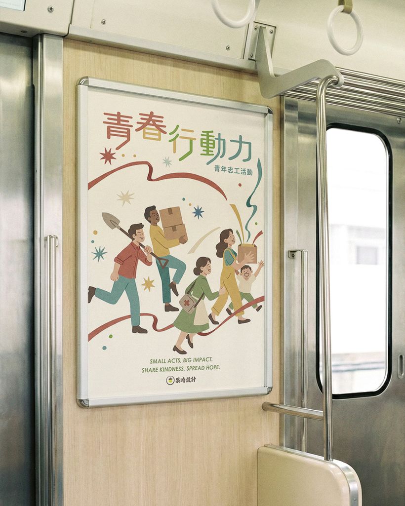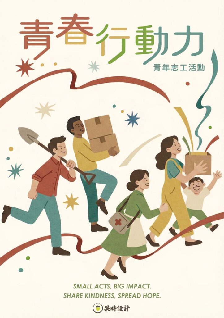 【青春行動力】是以青年志工活動為主旨創作/設計的海報。除了透過各種角色彰顯志工服務多元類型活動,也呈現以愛心為行動的奉獻,將使世界更加明亮閃耀。
